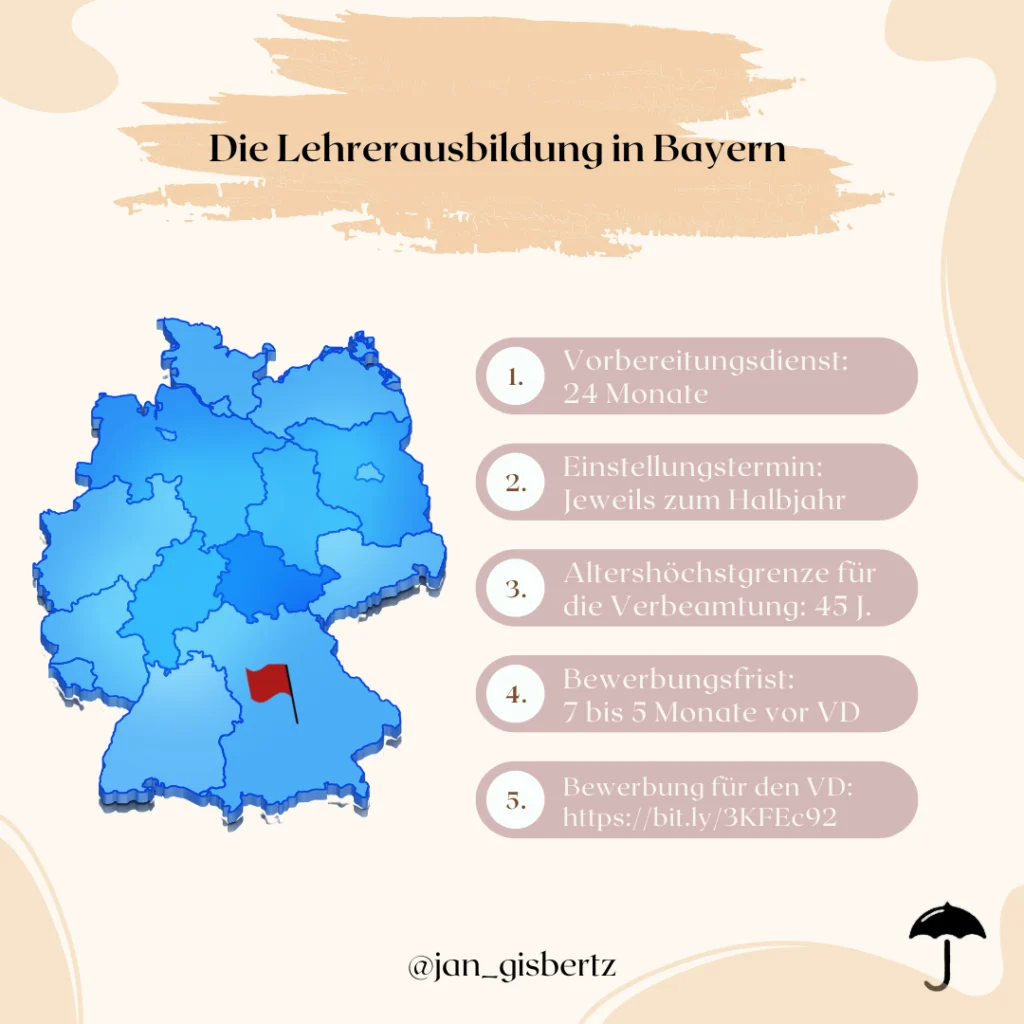 Der Vorbereitungsdienst dauert im Freistaat genau 24 Monate und Du kannst Dich auf zwei Einstellungstermine bewerben, die jeweils zum Halbjahr starten.